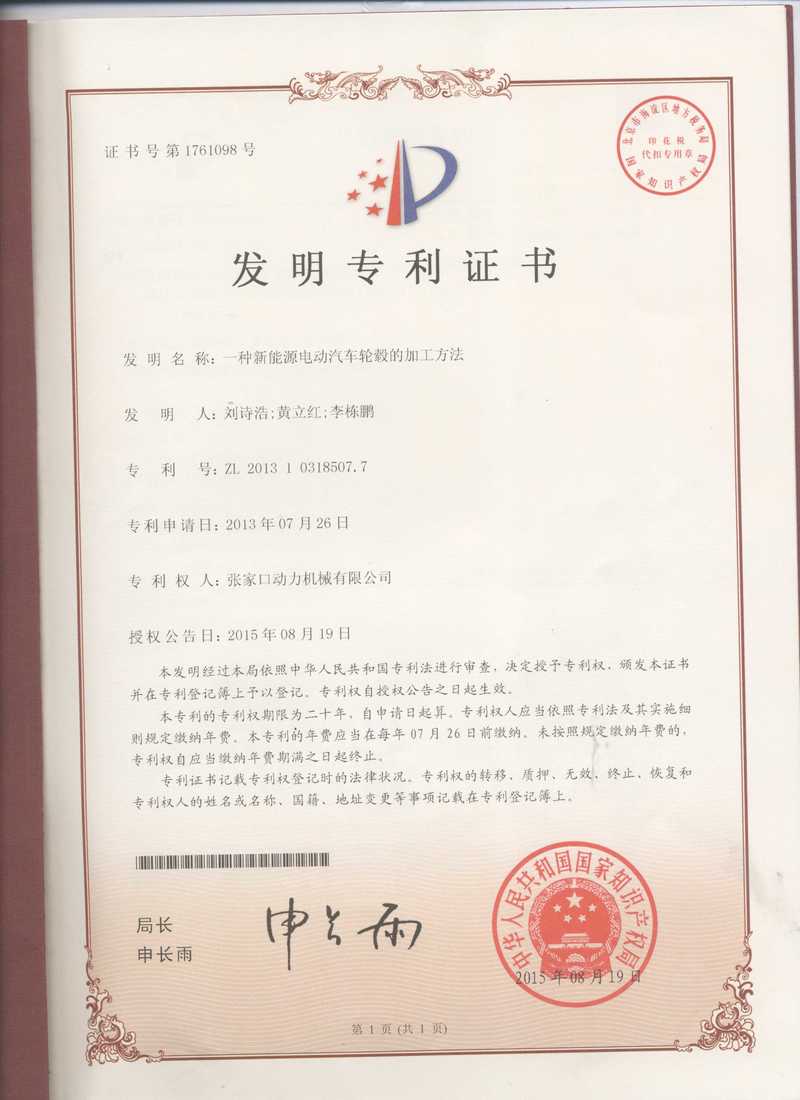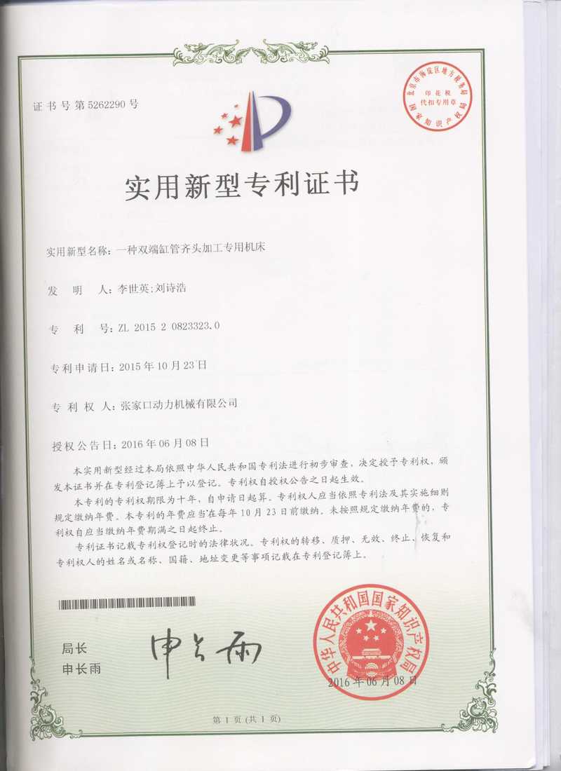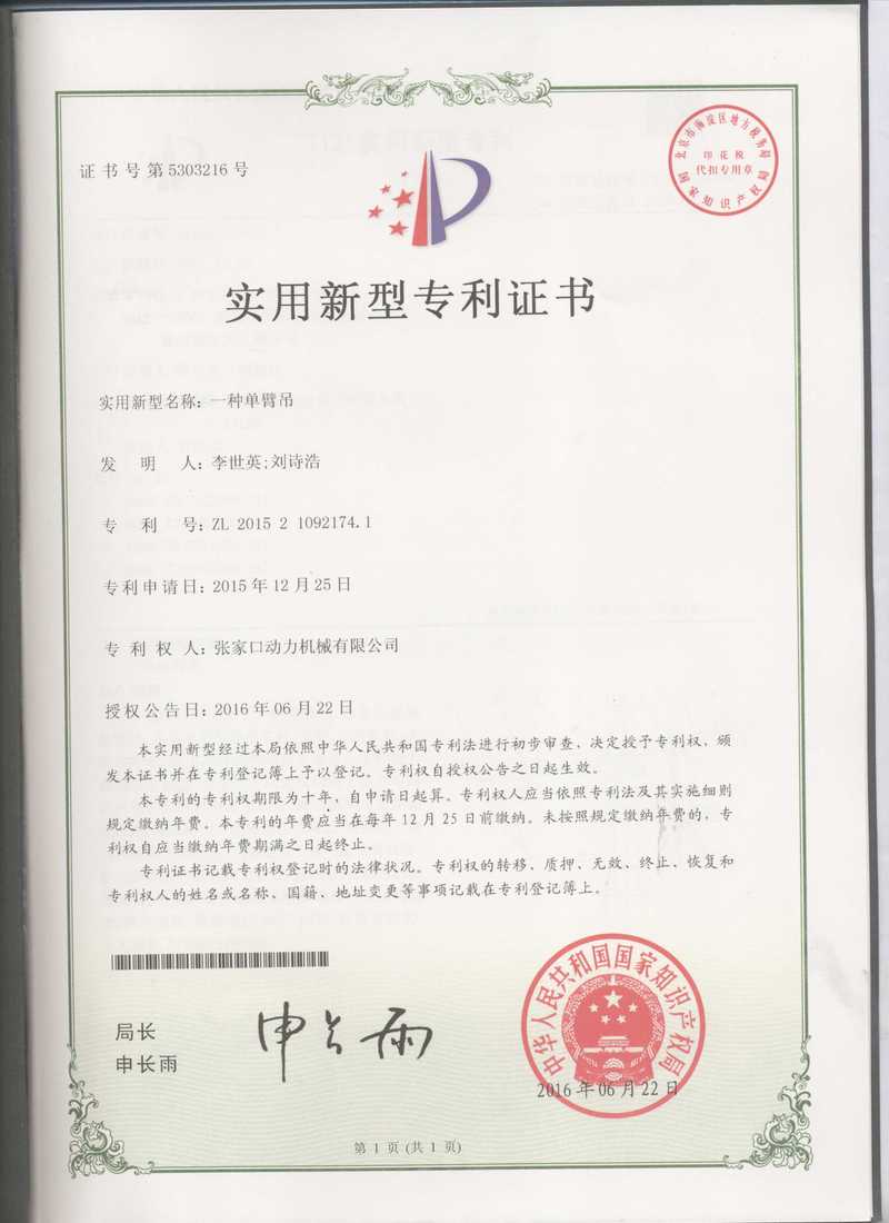 张家口动务机械有限公司专利证书展示